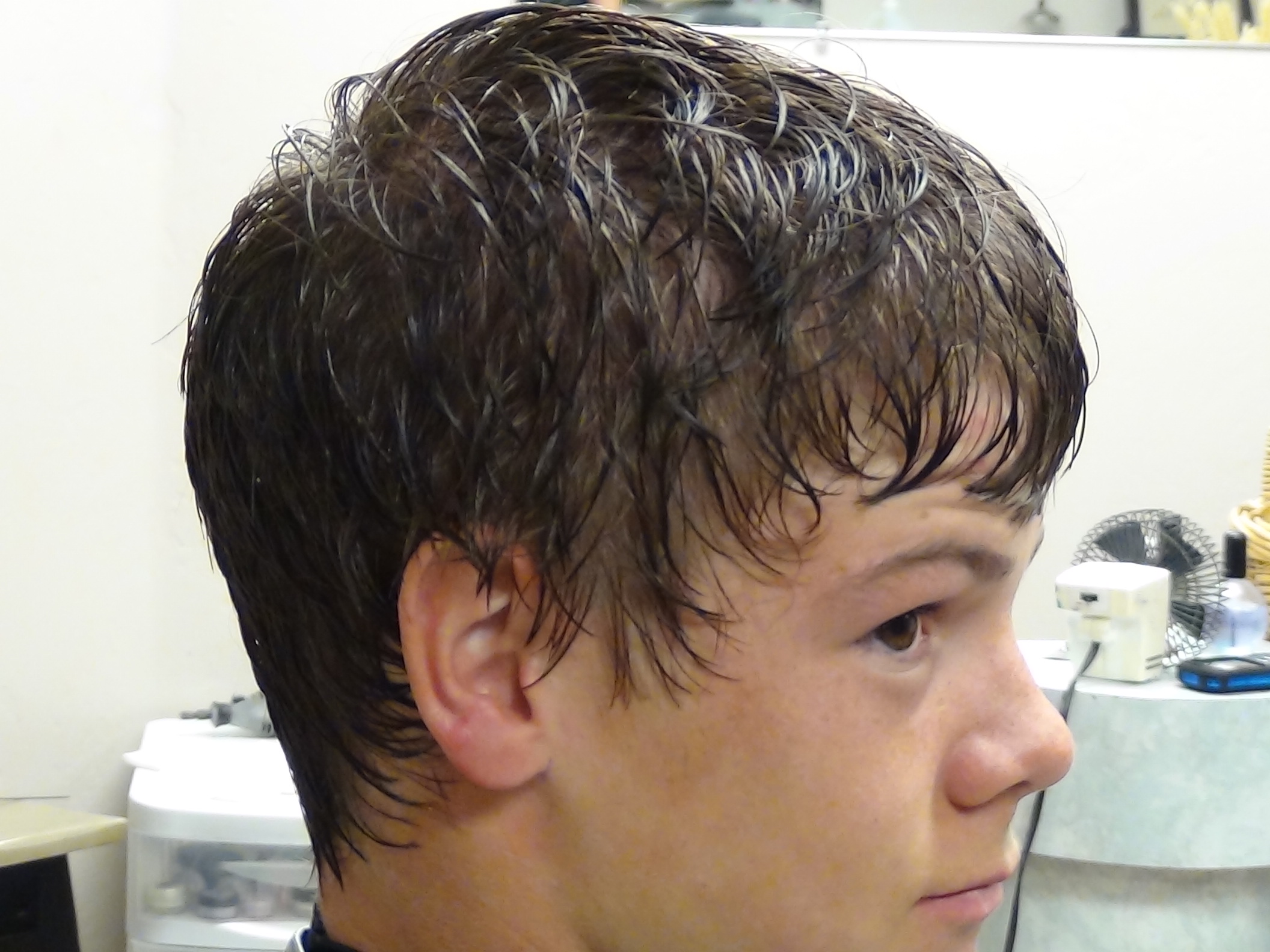 Boy with trendy haircut, styled with wet hair, showcasing a modern, youthful look in a salon setting, reflecting the "Trendy Boys Cut" tutorial.